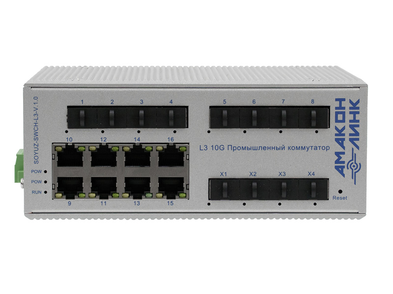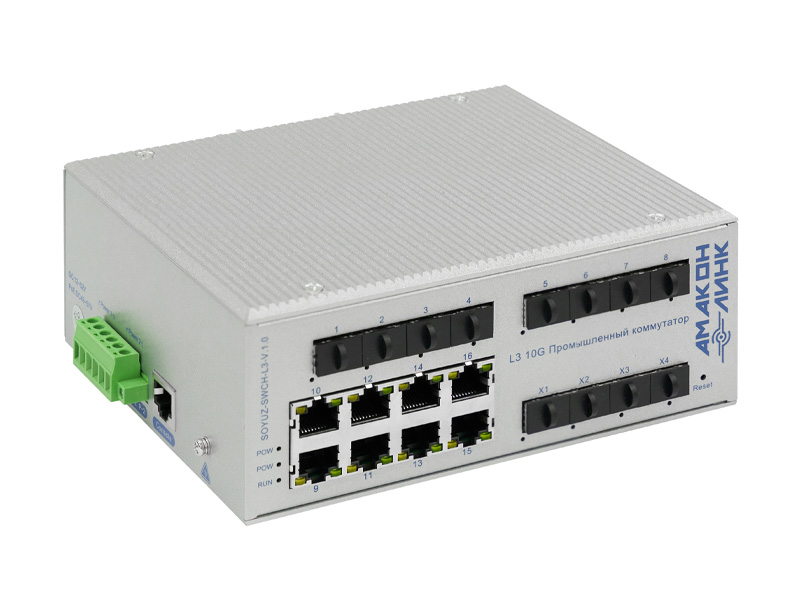 SOYUZ-SWCH-L3 — трёхуровневый управляемый (L3) промышленный оптический коммутатор, предназначенный для построения отказоустойчивых сетей передачи данных. Оснащён мощным процессором VCore-III (MIPS), поддерживает IPv4/IPv6, статическую и динамическую маршрутизацию (RIP, OSPF, VRRP), высокую пропускную способность и расширенные функции безопасности уровня L3/L4.