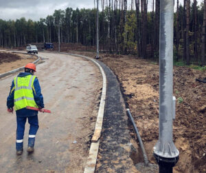 На данном отрезке мы выполняем прокладку электропитающего кабеля в грунт, установку опор освещения и монтаж светильников ИНТИС собственного производства.